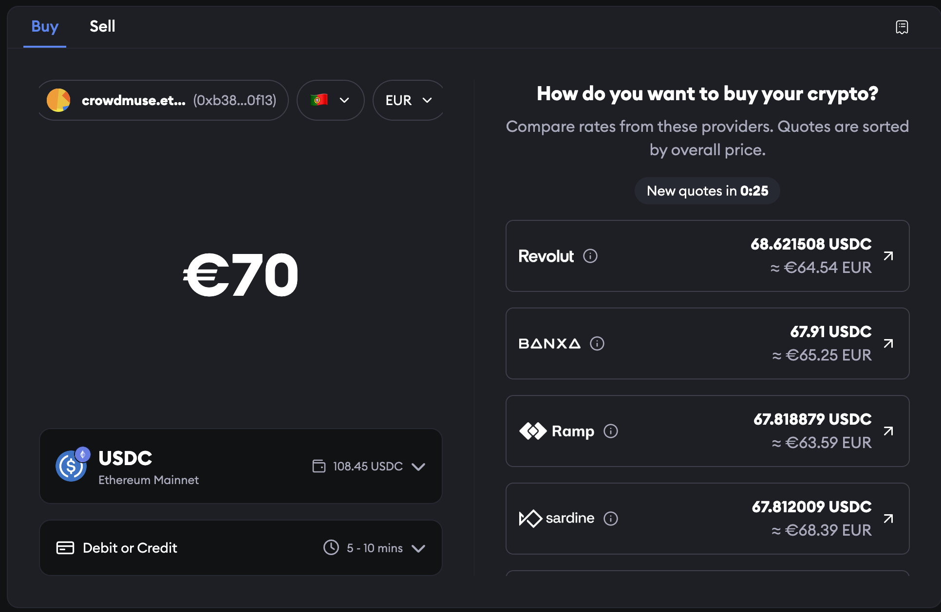 Choose which service to use to purchase USDC on Ethereum mainnet with your Debit or Credit Card. You will see different payment options depending on your region. Choose the one that is most convenient for you.&#x20;