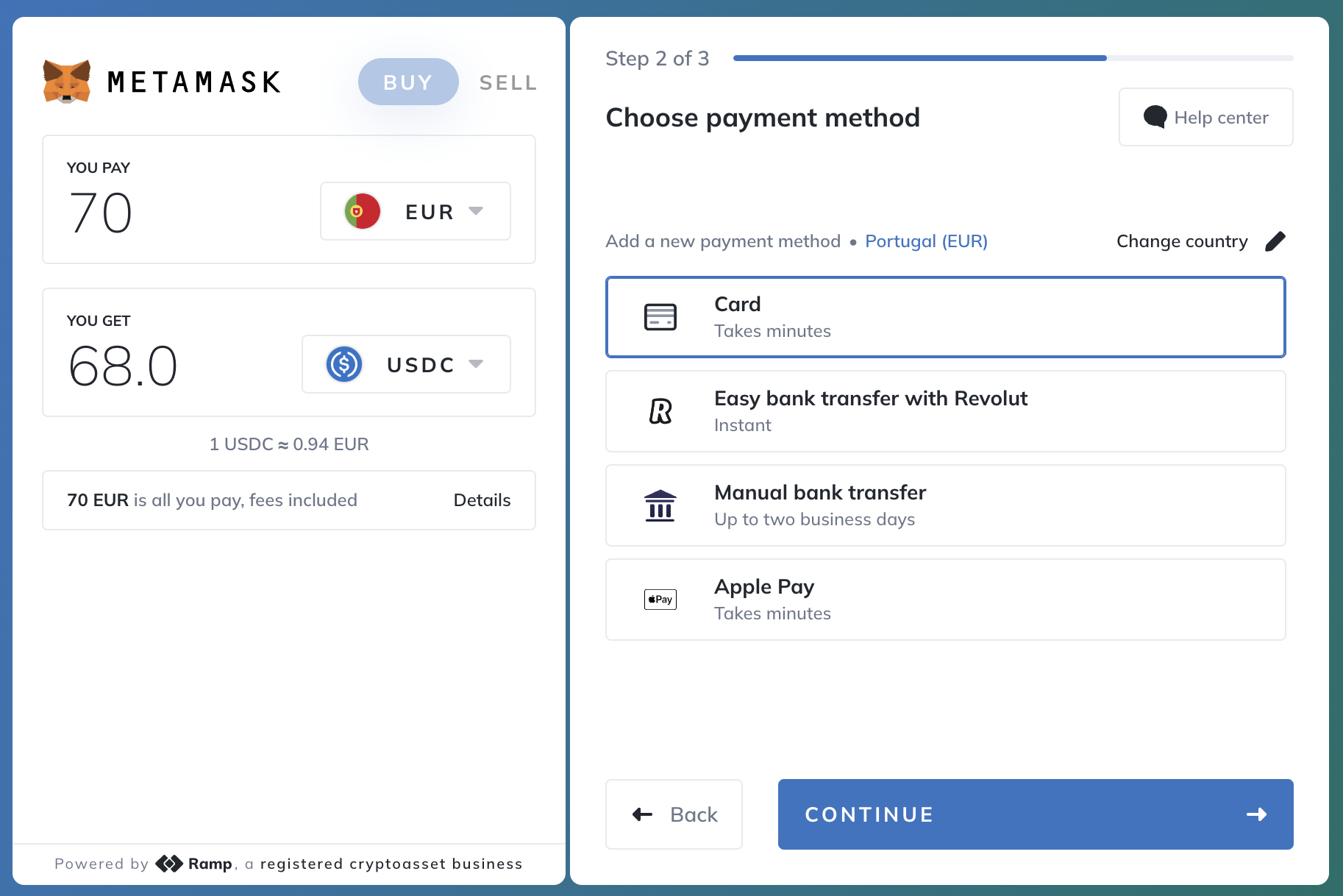 You will be taken to the MetaMask portfolio page, where you can choose your region, the currency you want to buy with, and the token you wish to purchase. The image below is used to purchase USDC on Ethereum Mainnet using EUR. Follow the same process to add ETH on Ethereum mainnet to cover gas.